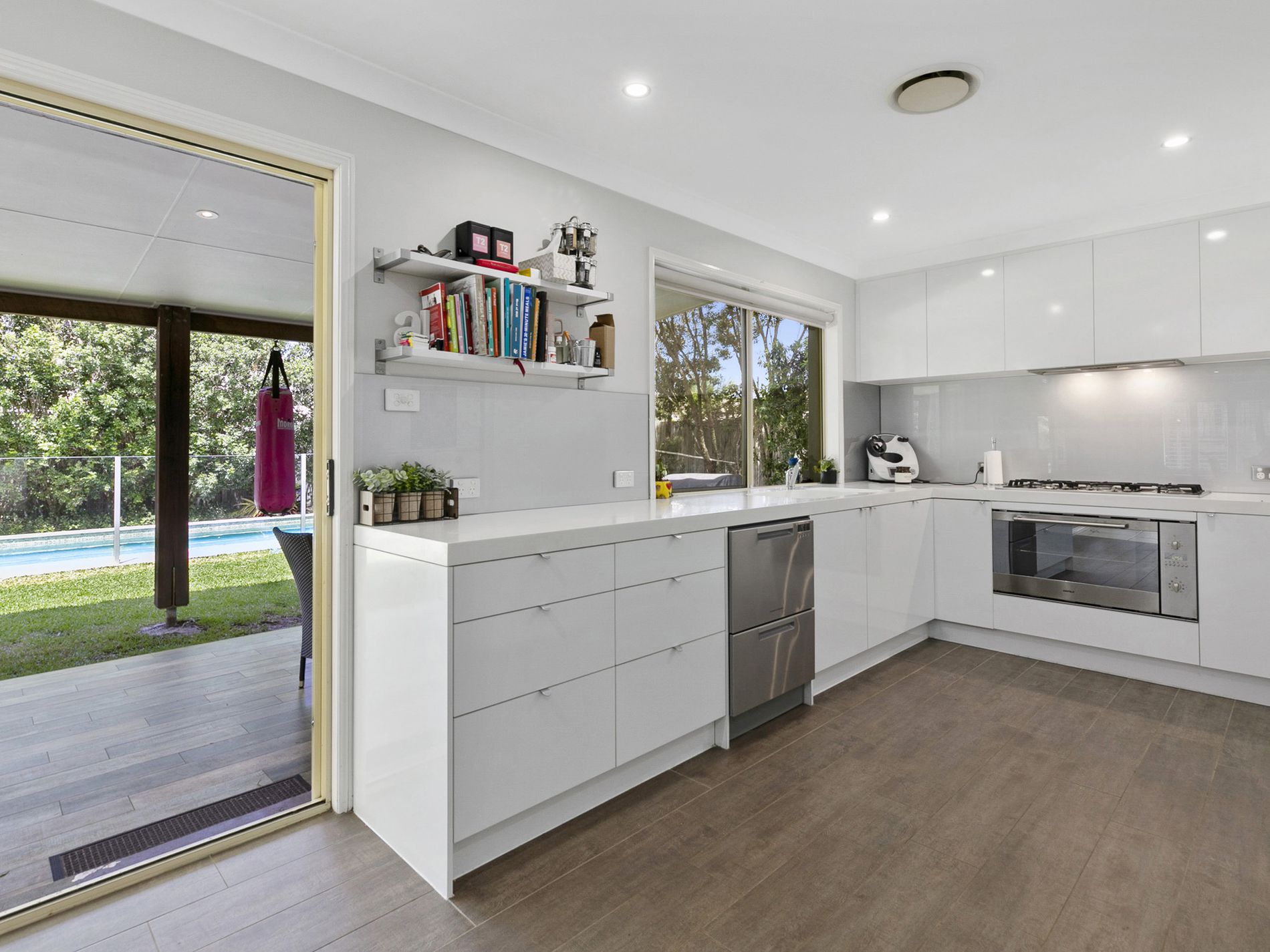 The cleverly designed groundfloor plan boasts an enviable chef's kitchen, complete with state of the art Hafele appliances and luxury Corian benchtops. Sparkling white benchtops compliment bespoke matte white cabinetry creating the perfect chefs kitchen with resort style views to the pool. Seamless flow from the spacious living areas to an expansive tiled entertaining deck through large glass doors allows for maximum airflow, space and practicality. Low maintenance gardens wrap the surrounds of the stunning inground pool, creating a perfectly private entertaining haven. A separate media/living room offers a restful retreat away from the outside entertaining hub, offering versatility and privacy in this contemporary family home.
